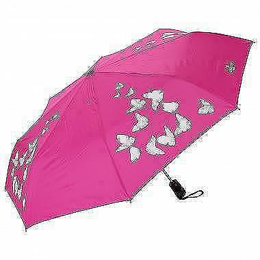 Стильный складной зонт-автомат розового цвета с рисунком порадует своей изюминкой — под воздействием воды принт на куполе меняет цвет.